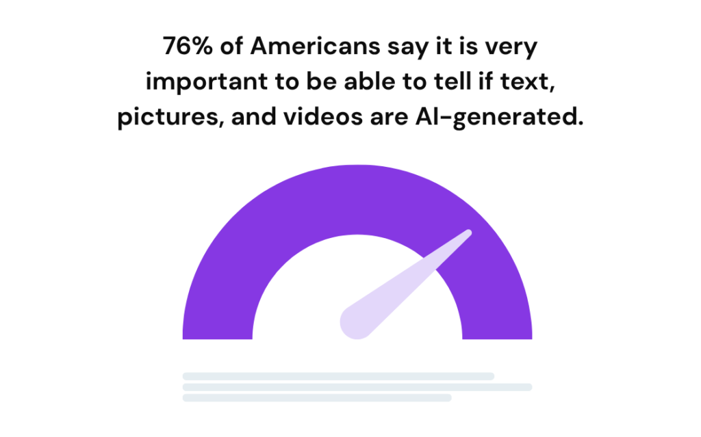 - 76% of Americans say it is extremely or very important to be able to tell if text, pictures, and videos are AI-generated.